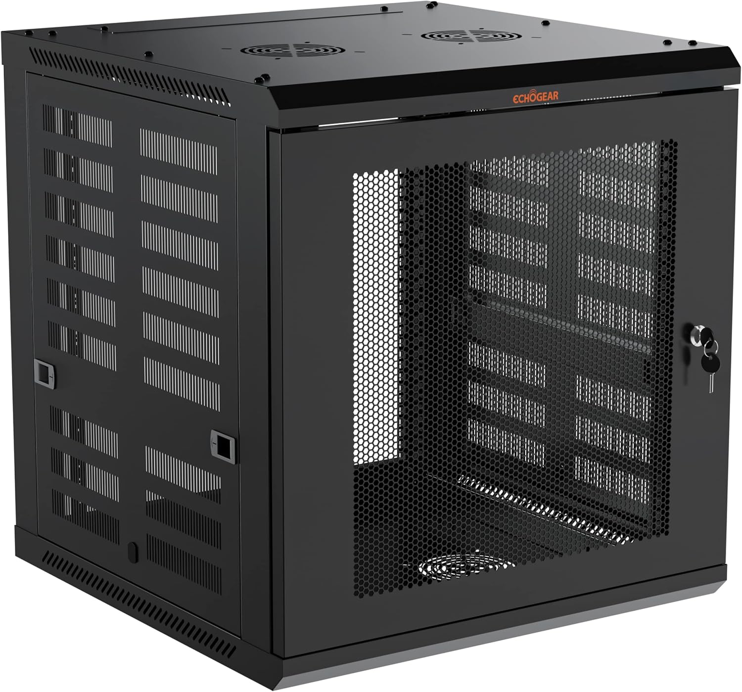 ECHOGEAR 12U Network Rack – Enclosed Wall Mount Rack Kit Includes 2X 1U Shelves, Pre-Mounted Fan, Lockable Door & Hardware – 600mm Depth Fits All Your AV Gear